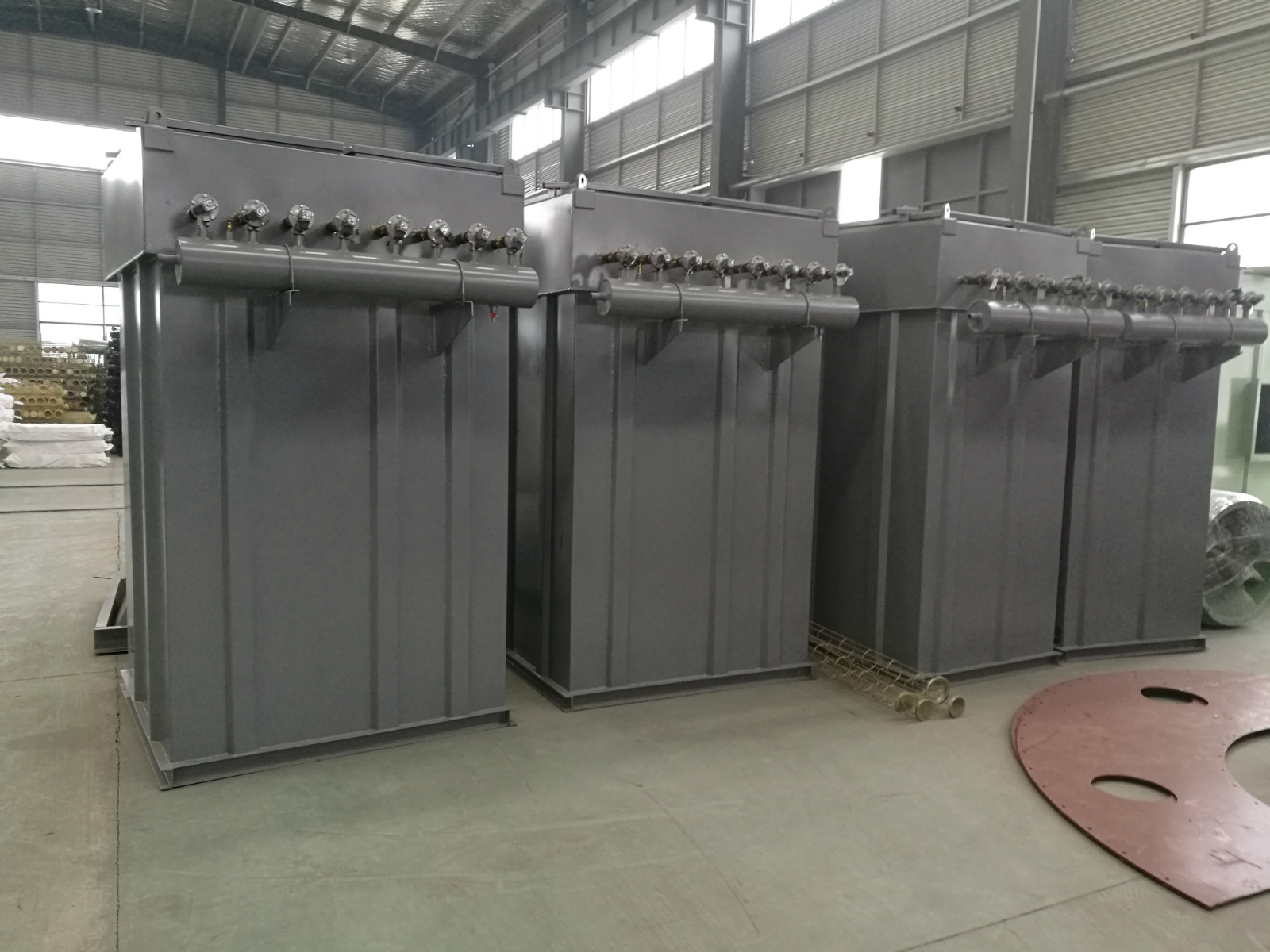 入滤袋室上部清洁室,汇集到出风口排出,含尘气体通过滤袋净化的过程中,随着时间的增加而积附在滤袋上的粉尘越来越多,增加滤袋阻力,